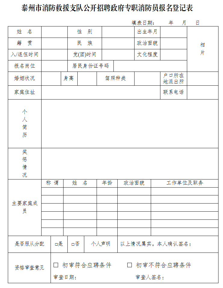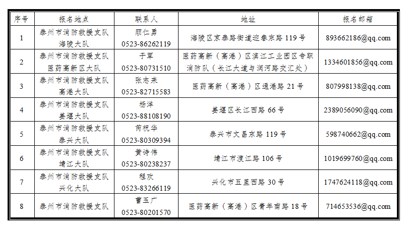 采取網(wǎng)上和實地報名方式。應(yīng)聘者須填寫《泰州市消防支隊公開招聘政府專職消防員報名登記表》(附件2),同時將本人身份證、戶口本、學(xué)歷證書、戶口所在地派出所出具的無違法犯罪記錄證明、所報考崗位所需證書、退役軍人及國家綜合性消防救援隊伍退出消防員相關(guān)證明等材料復(fù)印件發(fā)送至對應(yīng)報名單位的郵箱(添加時需要備注姓名、報名崗位、年齡、學(xué)歷、兵齡、隊齡)。